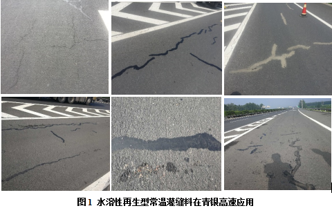 水溶性再生型常溫灌縫料為針對路面裂縫快速修復(fù)而開發(fā)的一種新型乳化瀝青材料,其含有的高性能新型聚合物,與SBS改性劑相比,粘彈性、恢復(fù)能力、耐疲勞能力及抗低溫開裂能力更加優(yōu)異,為灌縫料的耐久性及粘附性提供了有力保證。同時水溶性再生型常溫灌縫料施工季節(jié)長、施工工藝簡單,可對非結(jié)構(gòu)性破壞裂縫進行修復(fù),并可快速開放交通。其含有的新型聚合物改性瀝青增強了與縫壁的粘結(jié)力,實現(xiàn)了對縫壁處瀝青的再生,通過密封路面裂縫,防止水分侵入路面結(jié)構(gòu)內(nèi)部,延長路面使用壽命。