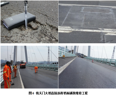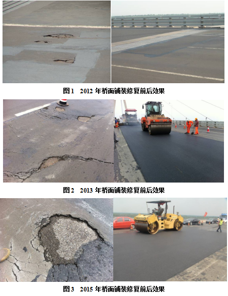 濟(jì)南黃河三橋是青銀高速濟(jì)南繞城大北環(huán)段跨越黃河的一座特大橋,該橋主橋規(guī)模在當(dāng)時(shí)同類橋梁中位居世界第二、亞洲第一。原橋面采用環(huán)氧瀝青混凝土鋪裝而成,2008年年底通車。2010年?yáng)|南端橋頭橋面鋪裝出現(xiàn)開裂,泛出銹跡;2011年橋面開裂位置松散和脫落,橋面板裸露,采用進(jìn)口修復(fù)膠進(jìn)行修復(fù);2012年,修復(fù)位置旁又出現(xiàn)大面積脫落和銹蝕,其他部位相繼產(chǎn)生了推移、開裂、脫落等損壞。2012年起至今,逐年應(yīng)用A1型、B型新型高黏瀝青進(jìn)行養(yǎng)護(hù)維修,應(yīng)用至今未產(chǎn)生任何病害,工程成本僅約為原鋪裝材料的1/3