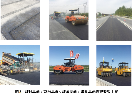 2016年,C型新型聚合物高黏瀝青應(yīng)用于濰日高速水穩(wěn)預(yù)開裂后的下面層,試驗(yàn)段效果良好,并應(yīng)用于京臺(tái)高速曲阜段基層病害處治,效果良好;20172020C型新型聚合物高黏瀝青分別在京臺(tái)高速、濰萊高速、濟(jì)萊高速濟(jì)南段及威青高速養(yǎng)護(hù)專項(xiàng)工程中使用。